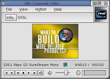В поставку QNX Realtime Platform входят также проигрыватель DVD (на базе XingDVD) и проигрыватель аудио/видео в формате MPEG 1/2, которые могут служить как самостоятельными приложениями, так и подключаемыми модулями (plugins) для Voyager, запускаемыми через специализированный тег.