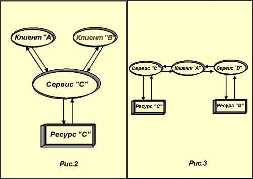 В роли клиента сервисов выступает программный модуль, который так и будем называть клиентом. Только клиент знает какие данные из какого сервиса должны быть взяты, в какой сервис направлены и в каком формате (Рис.1). Сервис может обслуживать нескольких клиентов (Рис.2) и обеспечивать им одновременный доступ к ресурсу, сохраняя при этом целостность и непротиворечивость данных. Один клиент может работать с несколькими сервисами одновременно независимо от их типа (Рис.3).