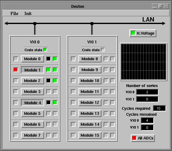 Система DEUTON предназначена для получения спектральных характеристик гамма-излучения, возникающего при взаимодействии пучка нейтронов с водородной мишенью. Гамма-излучение регистрируется двумя комплектами детекторов по восемь детекторов в каждом. Сигналы от каждого детектора обрабатываются собственным спектрометрическим прибором, который состоит из аналогового усилителя и АЦП, результат сохраняется в памяти. Каждый спектрометр выполнен в виде VXI модуля. Спектрометры собраны в двух конструктивах (крейтах) VXI по восемь в каждом. Приборы в крейтах управляются встроенными контроллерами фирмы Radisys Co. (Epc-7 и Epc-2), которые представляют из себя PC-совместимые компьютеры специального исполнения, имеющие доступ к шине VXI. В остальном это компьютер с набором обычных компонент - 486/ 20 MHz/ 8Mb RAM/100 Mb HD/Floppy 1.44, VGA/ COM1/ LPT1/ Ethernet NE2000.