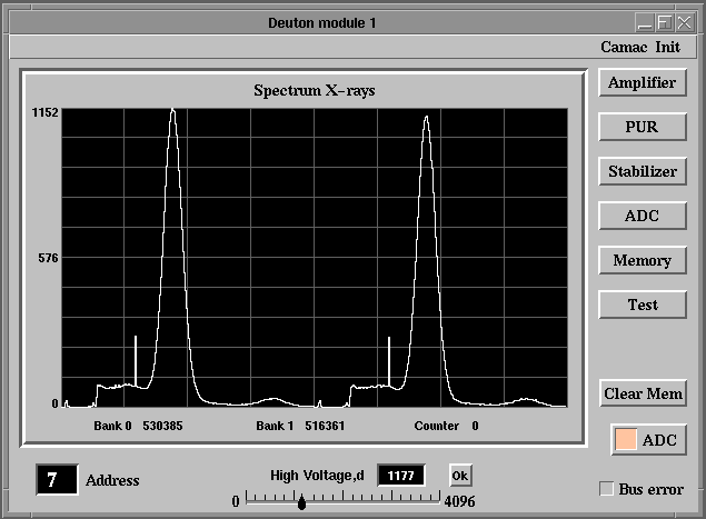 Для работы каждого детектора необходимо высокое напряжение (1-2кВ), которое вырабатывается программно-управляемыми источниками, выполненными в стандарте CAMAC. Сигналы с детекторов, помимо спектрометров подаются также на счетчики собранные в модулях CAMAC. В системе еще есть неуправляемые модули VXI и CAMAC, служащие для общей синхронизации и развязки различных сигналов. Модули в стандарте CAMAC собраны в трех крейтах, которые управляются 286 компьютером через адаптер ISA-CAMAC. Адаптер произведен в ПИЯФ и позволяет управлять с одного слота ISA четырьмя крейтами CAMAC.
