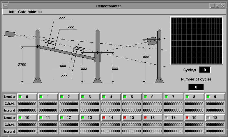 СКУ REFLECTOMETER предназначена для структурных исследований материалов. Пучок нейтронов под малым углом падает на поверхность исследуемого материала, отражается и попадает на 20-ти канальный детектор нейтронов. Детектор с усилителем, пороговым устройством и счетчиком образуют счетный канал. В отличии от системы DEUTON, где важны спектральные характеристики излучения, здесь нас интересуют интегральные данные - количество попавших на детектор частиц. Распределение счетов по каналам позволяет судить о структуре вещества.