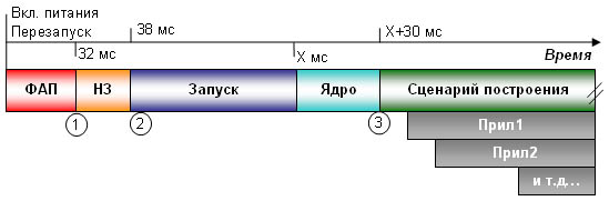 Рис. 1. Процесс начальной загрузки QNX Neutrino (длительности даны не в масштабе).