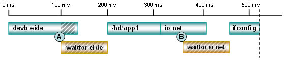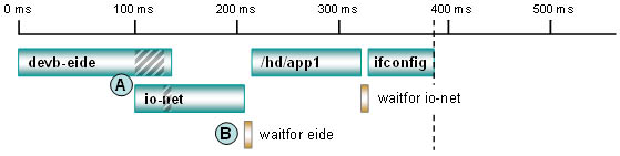 В точке А по сценарию запускается драйвер io-net, при этом используется время простоя драйвера EIDE и не используется команда waitfor до тех пор, пока она действительно не будет необходима. В точке В система готова к запуску приложения app1, и команда waitfor немедленно завершается, потому что уже было достаточно времени, чтобы драйвер завершил работу. Приложение /hd/app1 запускается чуть-чуть позже, чем в сценарии по умолчанию, но в целом загрузка проходит гораздо быстрее.