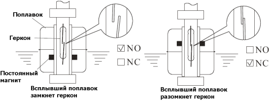 В трубку из нержавеющей стали или пластика вмонтированы один или несколько герметичных контактов (герконов). Вдоль по этой трубке под действием выталкивающей силы жидкости движется поплавок, внутрь которого вмонтирован тороидальный постоянный магнит. Когда этот магнит достигает уровня, на котором установлен геркон, то магнит своим магнитным полем изменяет состояние контакта геркона, закрывая или открывая его. Эти изменения состояния могут быть считаны, и введены во внешнюю систему управления уровнем жидкости. Рисунок, приведенный ниже, показывает взаимодействие магнита с герконом в случае с нормально открытым (NO) или нормально закрытым (NC) контактом.