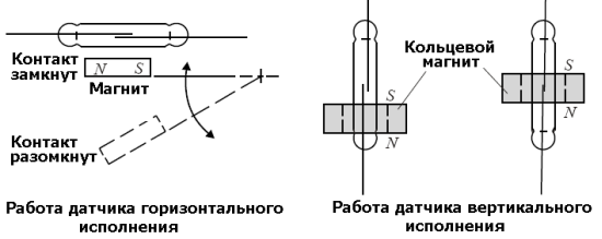 Рисунок ниже показывает принцип работы поплавковых магнитных датчиков горизонтального и вертикального исполнения. Когда магнитное поле, формируемое постоянным магнитом внутри поплавка, приближается к герметичному контакту (геркону), расположенному внутри стационарного стержня, то контакты геркона слипаются вместе, замыкая тем самым внешнюю электрическую цепь.