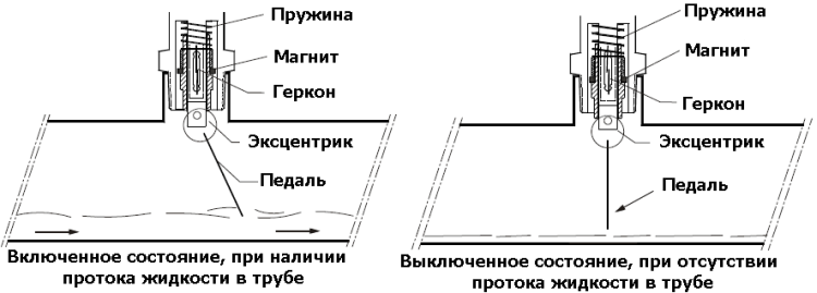 Датчик протока педального типа использует силу движущейся жидкости, направленную на смещение погруженной в жидкость педали, от строго вертикального состояния. При смещении педали на 20-30 градусов, эксцентрик смещает вверх магнит, магнитное поле которого активирует контакты геркона, замыкая внешнюю электрическую цепь. Длина педали настраивается в соответствии с диаметром трубы.