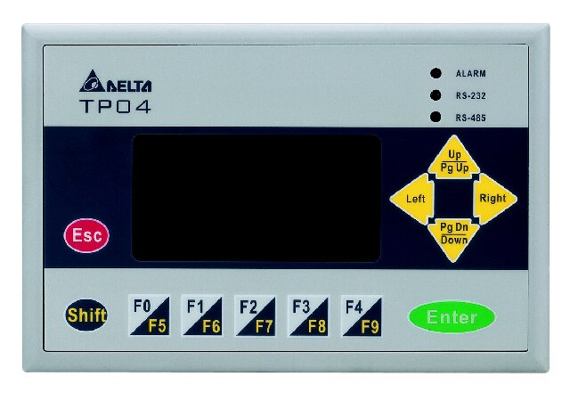 Delta Electronics, Простая текстовая панель, экран 128х64 (67х32мм), с 4-мя строками вывода информации и встроенной клавиатурой. Встроенные порты RS-485 и RS-232. Поддерживает различные протоколы обмена данными. Слот для карты копирования.