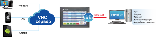 FTP сервер Каждая панель является FTP сервером, которым можно управлять для загрузки PDF файлов, рецептов, журналом операций, историей и аварийными сигналами через Ethernet