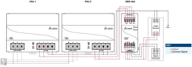 Режим резервирования и параллельная работа с модулем DRR Режим резервирования осуществляется через модуль DRR. Реализуется путем подключения двух источников питания, как показано на схеме, и источник большей мощности возьмет на себя всю нагрузку. Другой источник будет находиться в резерве. >>>