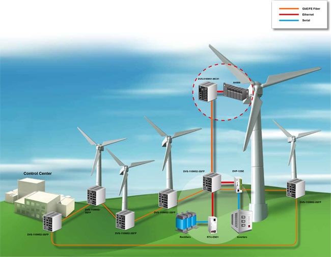 Ветроэнергетика Ветроэнергетика становится все более популярным альтернативным источником энергии в последние годы. Ветровые электростанции обычно расположены в удаленных областях, занимая иногда обширные территории. Кольцевая оптоволоконная сеть широко используется для управления и мониторинга в реальном времени состояний станционных щитов. Климатические условия работы станций могут быть весьма жесткими, с вредной и агрессивной окружающей средой, с большим перепадом дневных температур. Надежность работы таких станций может гарантироваться только при условии применения высоко помехозащищенных и надежных сетевых устройств.  Документация и каталоги