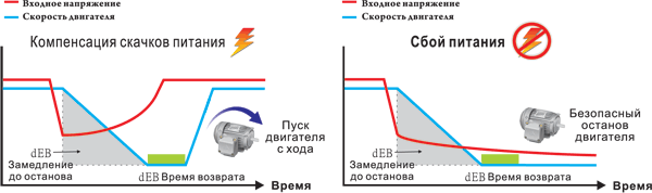 - Функция использования энергии торможения: Deceleration Energy Backup (dEB) Данная функция позволяет корректно остановить двигатель при внезапном отключении питания и помогает предотвратить механические повреждения. При восстановлении питания двигатель возвращается к работе на заданной скорости.