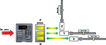 • Управление движением до трех осей с помощью одного процессора. Благодаря этому достигается высокая синхронность портального управления, упрощается монтаж и настройка системы. Есть возможность построения трехосевой системы с энергосбережением.