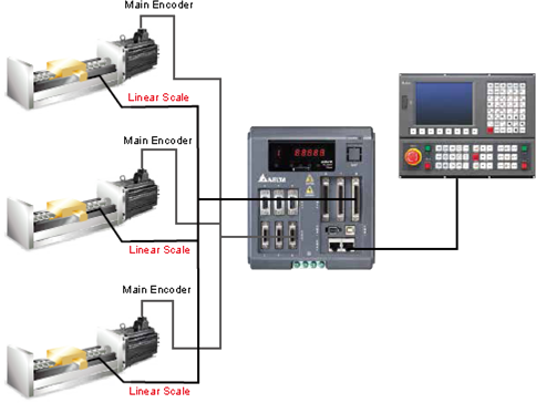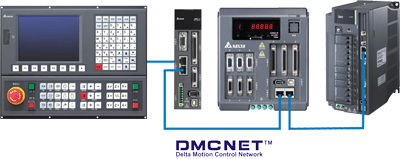 • Коммуникация по высокоскоростной системе управления перемещением от Delta DMCNET позволяет ЧПУ непосредственно управлять сервоприводами – регулировать усиление, задавать параметры привода, выполнять резервное копирование