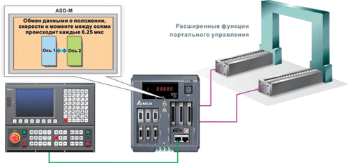 Значительный объем перерабатываемых данных и расчетов при трехкоординатном управлении осуществляется цифровым сигнальным процессором. Этот тип процессора оптимизирован для максимально быстрого выполнения специальных математических функций, содержащих сложные алгоритмы обработки сигналов, что повышает синхронность и точность, позволяет реализовать полноценное портальное управление. В общих системах или конкретных подсистемах, независимо от того, равны нагрузки на оси или нет, сервоприводы серии ASDA-M-F реализуют точное и одновременное управление движением по каждой оси (координате).