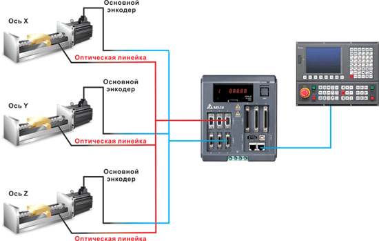 Сервопривод получает сигналы от энкодеров или датчиков линейных перемещений для выполнения компенсации позиции в режиме реального времени. Таким образом, происходит снижение погрешностей от работы оборудования и повышается точность позиционирования.