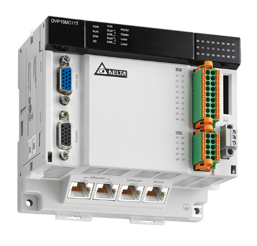 DVP-15MC: 1 порт CANopen в качестве хоста или ведомой станции, 1 порт CANopen (Motion) для управления движением, 2 порта Ethernet, 1 порт RS-232 и 1 порт RS-485