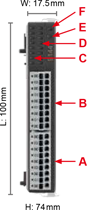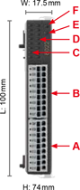 | NO. | Описание | | A. | Вход питания DC | | B. | Выход EtherCAT | | C. | Вход EtherCAT | | D. | Индикатор состояния (LED) | | E. | Индикатор питания (LED) | R1-EC5621D0 Удаленный модуль 1-канального импульсного вывода | NO. | Описание | NO. | Описание | | A. | Порт входов/выходов | D. | Индикатор сигнала вх/вых | | B. | Порт входов/выходов | E. | Индикатор состояния | | C. | Индикатор сигнала вх/вых | F. | Индикатор питания | | Вход | Описание | Вход | Описание | | 24V | Питание 24В | GND | Внешнее заземление | | MEL | Конечная точка (-) | QA+ | Фаза энкодера A (+) | | PEL | Конечная точка (+) | QA- | Фаза энкодера A (-) | | ORG | Сигнал Home | QB+ | Фаза энкодера B (+) | | ALM | Сигнализация серво | QB- | Фаза энкодера B (-) | | SON | Servo On | PA+ | Импульсный сигнал (+) | | CLR | Сброс сигнала серво | PA- | Импульсный сигнал (-) | | QZ+ | Фаза энкодера Z (+) | PB+ | Сигнал Dir. (+) | | QZ- | Фаза энкодера Z (+) | PB- | Сигнал Dir. (-) | R1-EC6002D0 / R1-EC6022D0 Удаленный модуль 16-канального ввода  | NO. | Описание | NO. | Описание | | A. | Клеммы порта 1 | D. | Сигнал вх/вых порта 1 X15~X08 (слева направо) | | B. | Клеммы порта 0 | E. | Индикатор состояния | | C. | Сигнал вх/вых порта 0 X07~X00 (слева направо) | F. | Индикатор питания | | Вход | Описание | Вход | Описание | | CM0 | Port 0 COM | CM1 | Port1 COM | | X00 | Вход 0 | X08 | Вход 8 | | X01 | Вход 1 | X09 | Вход 9 | | X02 | Вход 2 | X10 | Вход 10 | | X03 | Вход 3 | X11 | Вход 11 | | X04 | Вход 4 | X12 | Вход 12 | | X05 | Вход 5 | X13 | Вход 13 | | X06 | Вход 6 | X14 | Вход 14 | | X07 | Вход 7 | X15 | Вход 15 | R1-EC7062D0 Удаленный модуль 16-канального вывода | NO. | Описание | NO. | Описание | | A. | Клеммы порта 1 | D. | Сигнал вх/вых порта 1 X15~X08 (слева направо) | | B. | Клеммы порта 0 | E. | Индикатор состояния | | C. | Сигнал вх/вых порта 0 X07~X00 (слева направо) | F. | Индикатор питания | | Вход | Описание | Вход | Описание | | GND | Port 0 GND | GND | Port1 GND | | X00 | Port 0 Выход 1 | X08 | Port 1 Выход 1 | | X01 | Port 0 Выход 2 | X09 | Port 1 Выход 2 | | X02 | Port 0 Выход 3 | X10 | Port 1 Выход 3 | | X03 | Port 0 Выход 4 | X11 | Port 1 Выход 4 | | X04 | Port 0 Выход 5 | X12 | Port 1 Выход 5 | | X05 | Port 0 Выход 6 | X13 | Port 1 Выход 6 | | X06 | Port 0 Выход 7 | X14 | Port 1 Выход 7 | | X07 | Port 0 Выход 8 | X15 | Port 1 Выход 8 | R1-EC8124D0 Удаленный модуль 4-канального аналогового ввода  | NO. | Описание | NO. | Описание | | A. | Порт сигналов CH3/CH4 | D. | Индикатор сигналов CH3/CH4 | | B. | Порт сигналов CH1/CH2 | E. | Индикатор состояния | | C. | Индикатор сигналов CH1/CH2 | F. | Индикатор питания | | Вход | Описание | Вход | Описание | | GND | Аналоговая земля | GND | Аналоговая земля | | AI0 | Вход по току/ напряжению CH1 | AI2 | Вход по току/ напряжению CH3 | | GND | Аналоговая земля | GND | Аналоговая земля | | AG0 | Общий CH1 * | AG2 | Общий CH3 * | | GND | Аналоговая земля | GND | Аналоговая земля | | AI1 | Вход по току/ напряжению CH2 | AI3 | Вход по току/ напряжению CH4 | | GND | Аналоговая земля | GND | Аналоговая земля | | AG1 | Общий CH2 * | AG3 | Общий CH4 * | | GND | Аналоговая земля | GND | Аналоговая земля | *В токовом режиме: соединяйте общую клемму с клеммой GND ; В режиме по напряжению: отключите эту клемму R1-EC9144D0 Удаленный модуль 4-канального аналогового вывода  | NO. | Описание | NO. | Описание | | A. | Порт сигналов CH3/CH4 | D. | Индикатор сигналов CH3/CH4 | | B. | Порт сигналов CH1/CH2 | E. | Индикатор состояния | | C. | Индикатор сигналов CH1/CH2 | F. | Индикатор питания | | Вход | Описание | Вход | Описание | | GND | Аналоговая земля | GND | Аналоговая земля | | VO0 | Выход по наряжению CH1 | VO2 | Выход по наряжению CH3 | | GND | Аналоговая земля | GND | Аналоговая земля | | IO0 | Токовый выход CH1 | IO2 | Токовый выход CH3 | | GND | Аналоговая земля | GND | Аналоговая земля | | VO1 | Выход по наряжению CH2 | VO3 | Выход по наряжению CH4 | | GND | Аналоговая земля | GND | Аналоговая земля | | IO1 | Токовый выход CH2 | IO3 | Токовый выход CH4 | | GND | Аналоговая земля | GND | Аналоговая земля