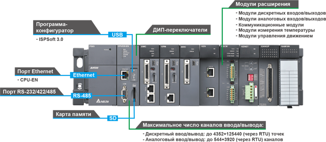 Базовый модуль CPU530, мини USB, 1хRS232/485, Ethernet, MicroSD-карта, 4096 I/O, 256К шагов, DM 64K слов, 7 расширений локальных I/O |