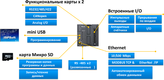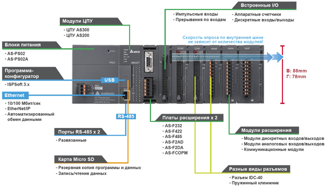 Процессорный модуль AS300, 128K шагов, 16DI/16DO (NPN), Ethernet, 2xRS485, mini USB, micro SD, 2 слота под платы расширения |