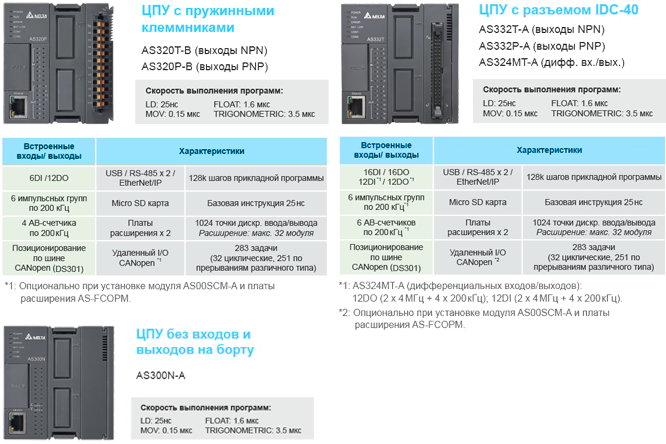 Процессорный модуль AS300, 128K шагов, 12DI (4 диф.+ 8 24VDC/12DO (4 диф.+8 NPN), Ethernet, 2xRS485, miniUSB, microSD, 2 слота под пл/расш |