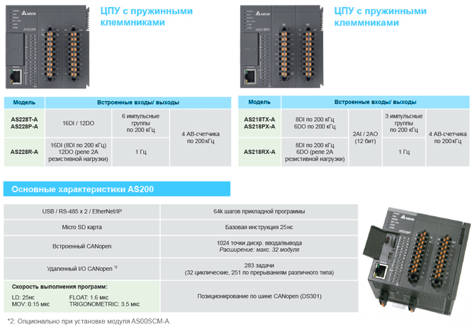 Процессорный модуль AS200, 64K шагов, 16DI/12DO (реле), Ethernet, CANopen, 2xRS485, mini USB, micro SD |