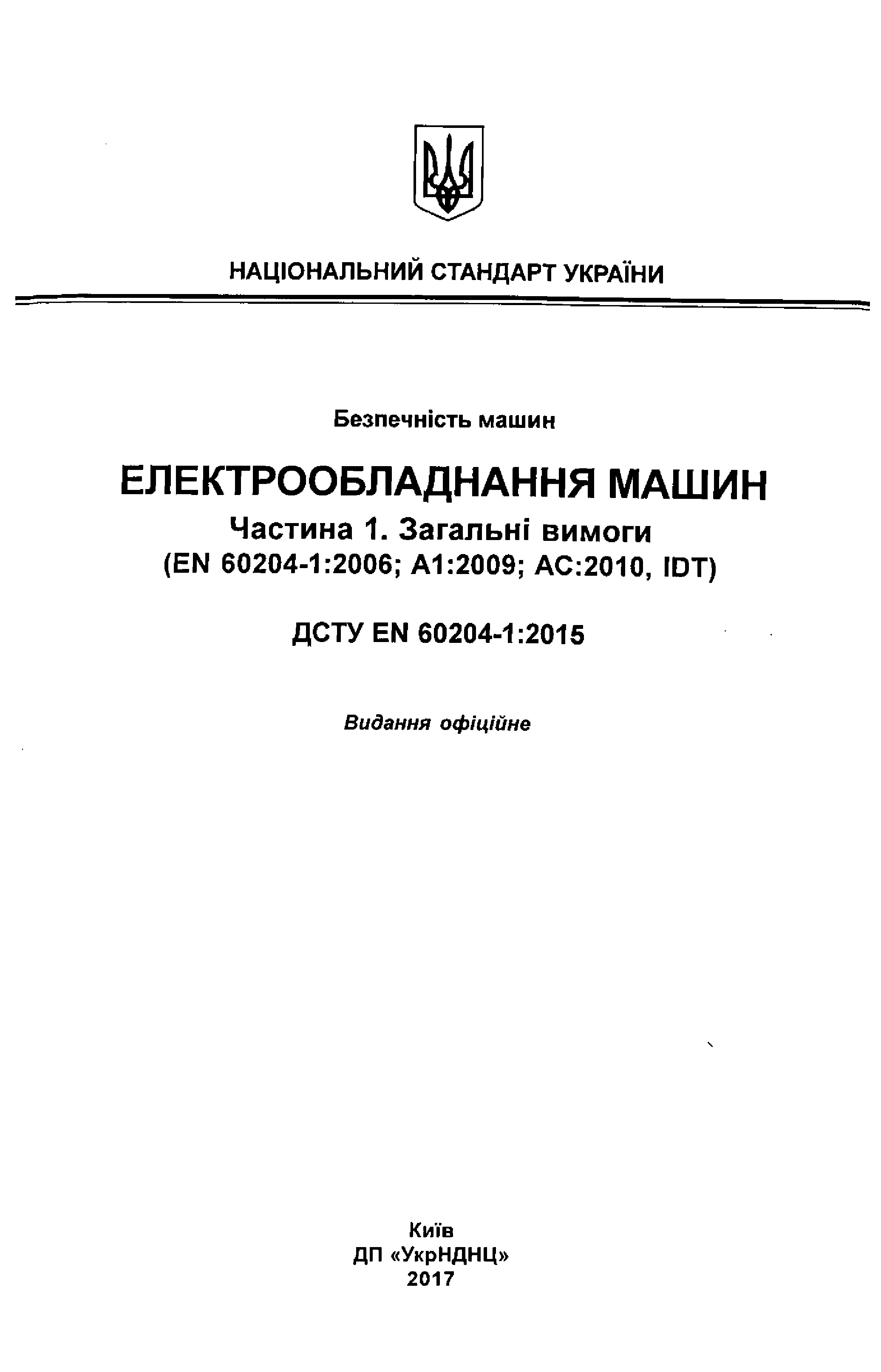 ДСТУ EN 60204-1:2015 БЕЗПЕЧНІСТЬ МАШИН ЕЛЕКТРООБЛАДНАННЯ МАШИН Частина 1. Загальні вимоги (EN 60204-1:2006; А1:2009; АС:2010, IDT)