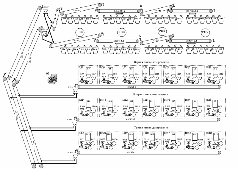 Вторая и третья линии дозирования состоят из семи однотипных непрерывных дозаторов ( каждая) , сборного ленточного конвейера и шибера .