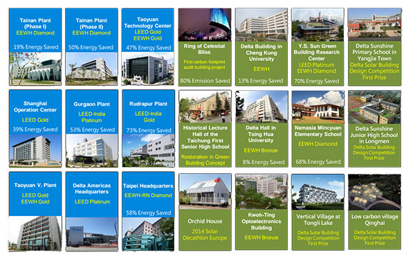 Delta внедрила более 10000 позиционеров солнечных батарей в США, с точностью позиционирования, превышающей среднюю на рынке в 1.5 раза, 388 зарядочных станций с более, чем 1000 зарядочных мест в Норвегии, построила штаб квартиру в Фремонте, США, которая сама является “зеленым” домом с нулевым потреблением энергии, впервые сертифицированным платиновым сертификатом LEED. Стратегически Delta последовательно переходит от поставки компонент и устройств к поставке интегрированных систем и решений.