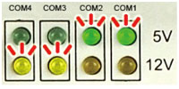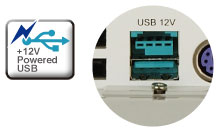 Для удобства подключения периферии внешние коммуникационные порты IBX-900 имеют дополнительные выводы питания 5 или 12В (функция 9-го контакта D-SUB разъема СОМ порта определяется перемычкой). USB порты также имеют дополнительный вывод 12В, что позволяет подключить принтер, сканер штрих кода, платежный терминал и др. Для удобства диагностики вид напряжения, выведенного на СОМ порт, отображается на индикаторной панели.