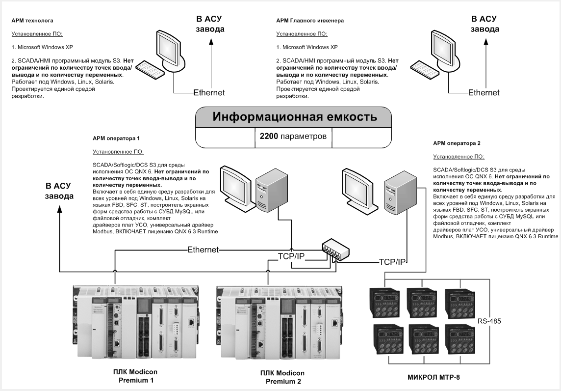 На верхних уровнях АСУ ТП имеются АРМ технолога и АРМ Главного инженера, на которых работают S3-HMI под управлением MS Windows.