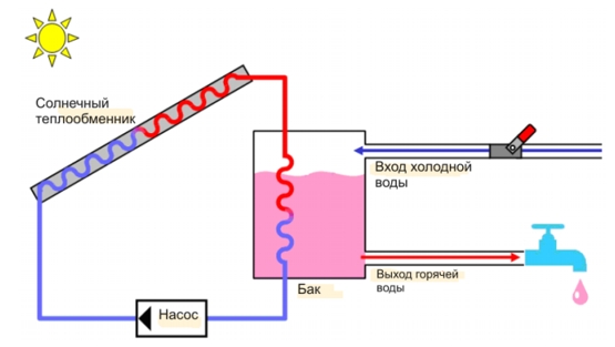 На рис.1 приведена схема солнечной водонагревательной установки. В солнечном теплообменнике, заполненном нетоксичным незамерзающим теплоносителем, происходит нагрев теплоносителя, и с помощью насоса обеспечивается его циркуляция.