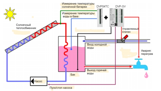 Как показано на рис.2, к используемому в такой системе контроллеру DVP-28SV подсоединён температурный модуль DVP04TC, имеющий 4 канала измерения, благодаря которому обеспечивается измерение температуры воды в баке и воды в выходной трубе.