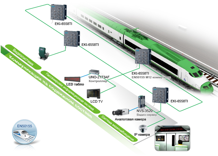 Промышленные Ethernet коммутаторы и последовательные девайс-серверы компании Advantech являясь ядром сети позволяют на железнодорожных станциях контролировать и осуществлять передачу информации в реальном времени из центра управления на мониторы системы. Передаваемая информация может включать различное информацию о прибытии и отправлении поездов, новости, рекламу, информацию в случае чрезвычайных ситуаций , что повышает эффективность и безопасность движения пассажиропотоков.