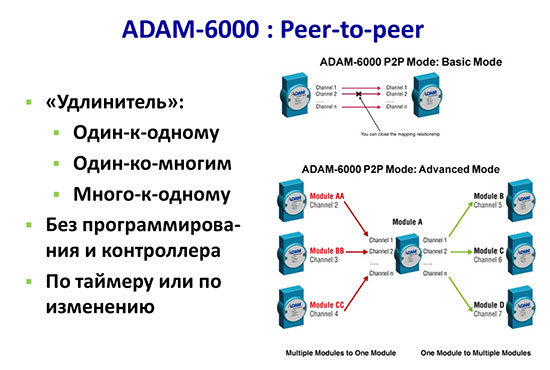 Но и это еще не все. В наше время, когда некогда напрягаться даже для изучения FBD, эти модули можно применять вообще без программирования. Ну например, если вам нужно перекинуть десяток аналоговых или дискретных сигналов из шкафа в шкаф, при этом не беспокоясь ни о помехах, ни о расстояниях между ними. Можно и размножить один сигнал, подав его сразу в несколько шкафов, разбросанных по площадке. Одни модули ADAM будут транслировать цифровые или аналоговые сигналы со своих входов на соотвтсвующие выходы других модулей ADAM. При этом физически они будут соединены цифромым интерфейсом RS-485 по витой паре. Есть вариант заменить витую пару оптоволокном, либо беспроводным интерфейсом.