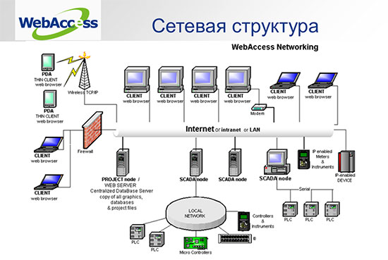 Ну и самодостаточный бренд обязан иметь собственную SCADA . SCADA WebAcces Advantech - полностью Web и Cloud ориентирована, клиенты работают на любых устройствах, в браузерах, поддерживающих HTML5. По сути дела, этой SСADA клиент как таковой не нужен - достаточно иметь настольный или мобильный компьютер, телефон, имеющий браузер.