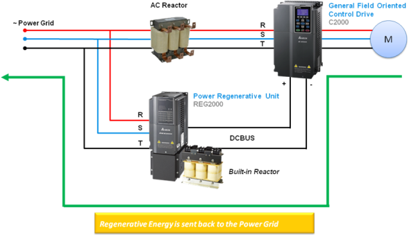Рисунок 3. Применение рекуператора REG2000 вместо традиционных тормозных резисторов возвращает в сеть энергию, генерируемую в процессе торможения механизмов