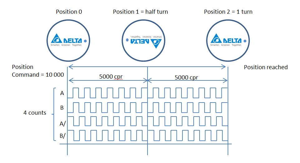 Единицей измерения перемещения являются импульсы ppr , либо отсчеты cpr энкодера. За каждый оборот вала экодер со стандартным парафазным выходным сигналом ABZ генерирует N имульсов и 4N отсчетов, включающие в себя все фронты прямых и инверсных фаз. Таким образом энкодер с разрешением 2500 ppr импульсов на оборот генерирует 2500х4 = 10 000 cpr отсчетов, которые мы и должны принимать во внимание.