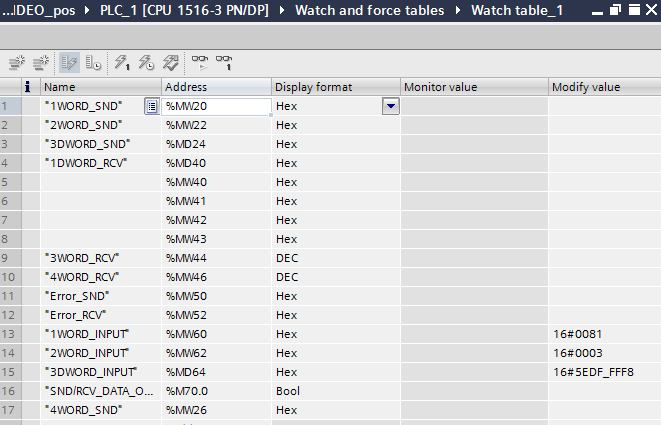 Все передаваемые в привод данные , а так же вычитываемые из привода отображаются в стандартной таблице Watch table TIA Portal.