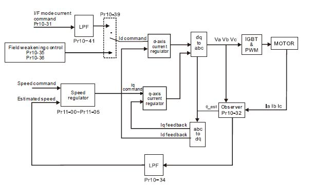 Векторный режим режим преобразователей частоты серии C2000 Delta построен по классической схеме с использованием преобразований Кларка и Парка с переходом к вращающейся системе координат с наблюдателем и имеет множество тонких настроек, с помощью которых можно добиться большей точности, удерживающего момента и плавности хода.
