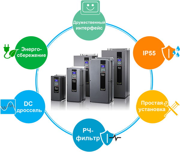 Этот преобразователь, в минимальном варианте, вы можете просто повесить на стену в котельной или насосной, подведя к нему питание и подключив двигатель, сэкономив деньги и время на шкафе и его внутреннем монтаже. Все остальное в ПЧ уже есть - это входной размыкатель, фильтр ЭМС, дроссель в звене постоянного тока, ПЛК на 10 тыс шагов, локализованная панель управления с конфигурируемыми экранами и часами/календарем.