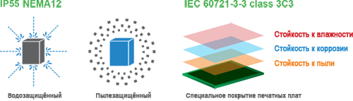 Преобразователь частоты надежно защищен от водяных струй с любого направления, а также от пыли, платы ПЧ покрыты специальным составом по IEC 60721-3-3 Class 3C3, устойчивым к солям, SO2, озону, H2S и другим агрессивным газам, влаге, пыли, что очень важно для многолетней беспроблемной работы в приложениях водоподготовки. Преобразователь работает от -15С до +50С и даже до +60 С ( с деградацией).