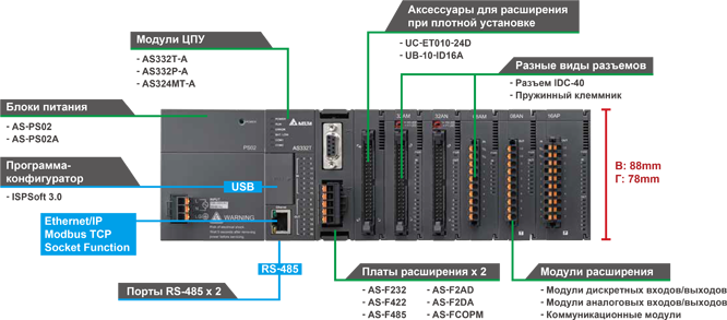 Младшие ПЛК Delta не имеют традиционной “корзины” или пассивной объединяющей платы. Такая конструкция обладает рядом преимуществ. Во-первых уходит одно лишнее разъемное соединение и один элемент системы, что по теоретически повышает надежность. Во-вторых это просто дешевле.